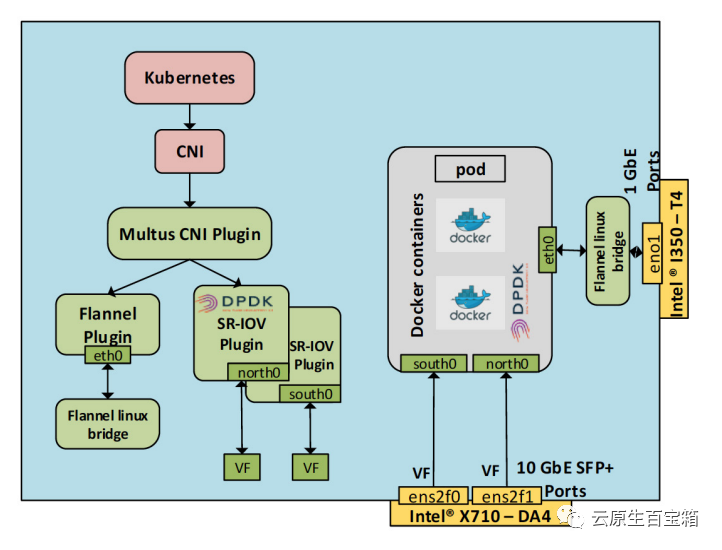 multus 是 intel 开源的 CNI 方案,是由传统的 cni 与 multus,并且提供了 SR-IOV CNI 插件使 K8s pod 能够连接到 SR-IOV VF 。这是使用了 IPVLAN/MACVLAN 的功能。