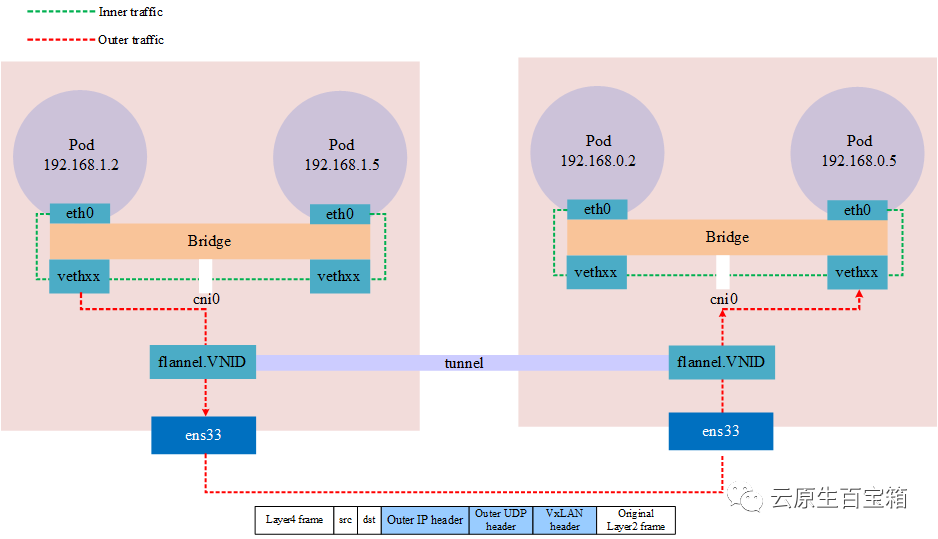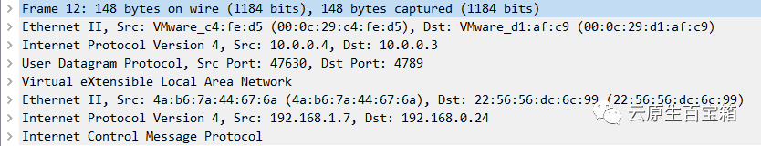 Notes:VxLAN 使用的 4789 端口,wireshark 应该是根据端口进行分析协议的,而 flannel 在 linux 中默认端口是 8472,此时抓包仅能看到是一个 UDP 包。