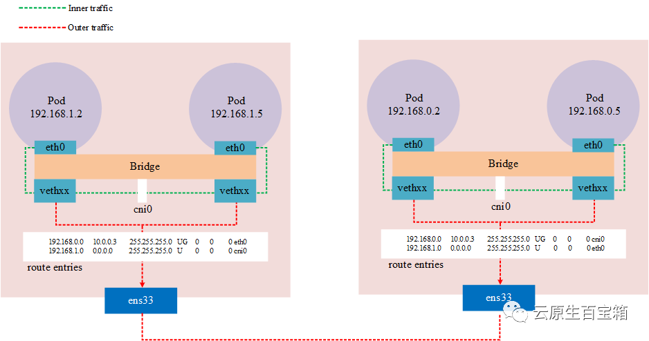 Notes:通过路由方式,集群的 cidr 至少要配置 16,因为这样可以保证,跨节点的 Node 作为一层网络,同节点的 Pod 作为一个网络。如果不是这种用情况,路由表处于相同的网络中,会存在网络不可达