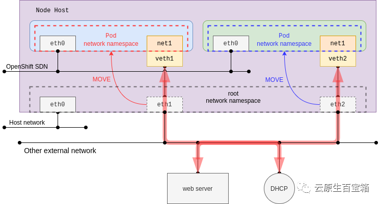 与此同时,也可以将主机接口直接移动到 Pod 的网络名称空间,当然这个接口是必须存在,并且不能是与默认网络使用同一个接口。这种情况下,在普通网卡的环境中,就直接将 Pod 网络与 Node 网络处于同一个平面内了。