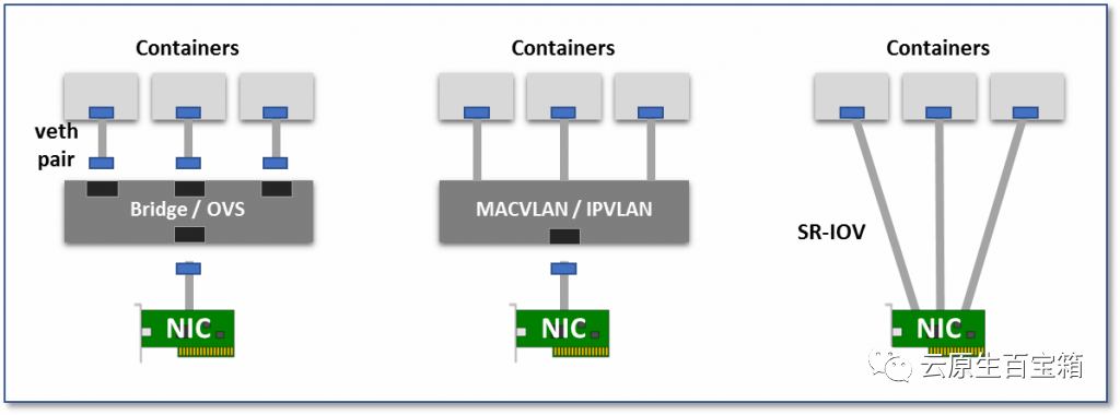 因为是网卡虚拟化技术,而不是网络虚拟化技术,本质上来说属于 Overlay network,这种方式在虚拟化环境中与 Overlay network 相比最大的特点就是可以将 Pod 的网络拉平到 Node 网络同级,从而提供更高的性能、低延迟的网络接口。本质上来说其网络模型属于下图中第二个。