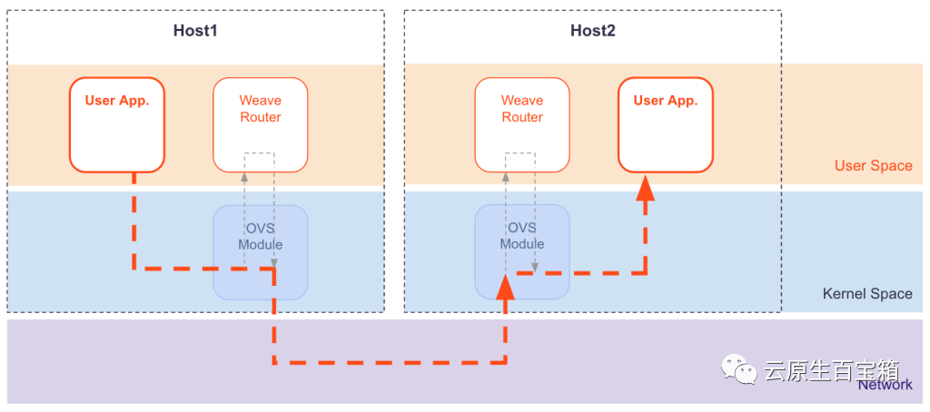 Notes:fastdp 工作在 Linux 内核版本 3.12 及更高版本,如果低于此版本的例如 CentOS7,weave 将工作在用户空间,weave 中称之为 sleeve mode。
