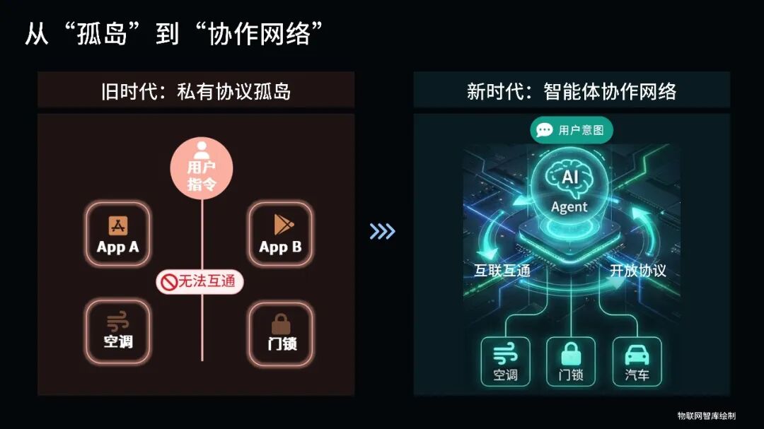 AI开始为物联网注入“智商”。摄像头不再只是录像,它能认出你是谁;音箱不再只是播放器,它能听懂你说什么。设备从传感器升级为具备一定认知智能的设备。但即便如此,它们仍然是被动的,你必须明确地告诉Siri打开客厅的灯,它不会主动思考你为什么需要光。