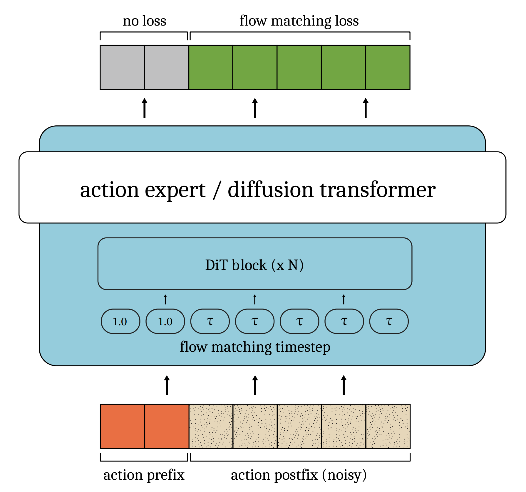 对于采用adalN-zero条件化处理流匹配时间步长的类扩散变换器架构[16],这很简单——只需允许不同token间的缩放、平移和门控参数不同。此修改不改变可学习参数数量 - 对前缀使用真实无噪动作,并将对应流匹配时间步长设为1。后缀部分保持不变