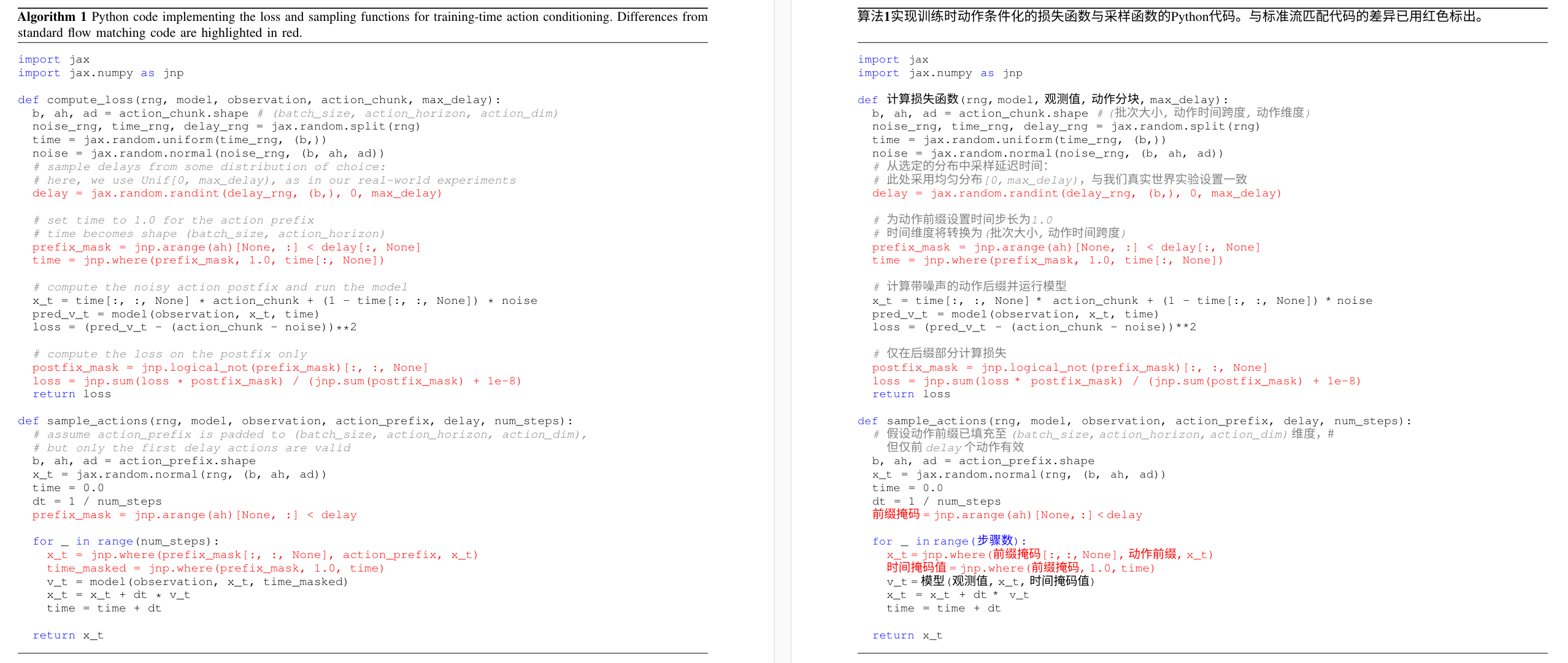 完整实现损失计算与动作生成的Python代码请参见算法1。 实际应用中,由于无法预先获知确切的推理延迟(且现实场景中的推理延迟可能存在波动),在训练期间对延迟量 进行随机采样