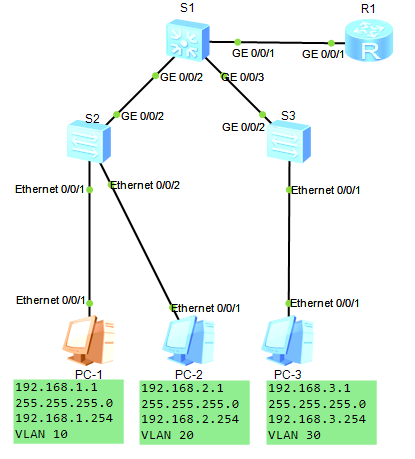 [S1]vlan batch 10 20 30 //创建VLAN 10 20 30[S1]interface GigabitEthernet 0/0/2 //进入千兆以太网接口0/0/2口