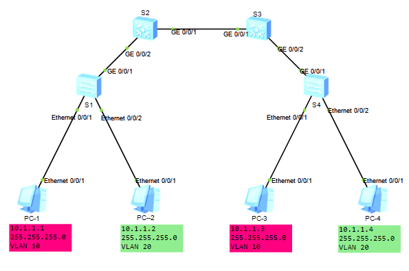 [S4-Ethernet0/0/1]port link-type access //接口设置为Access