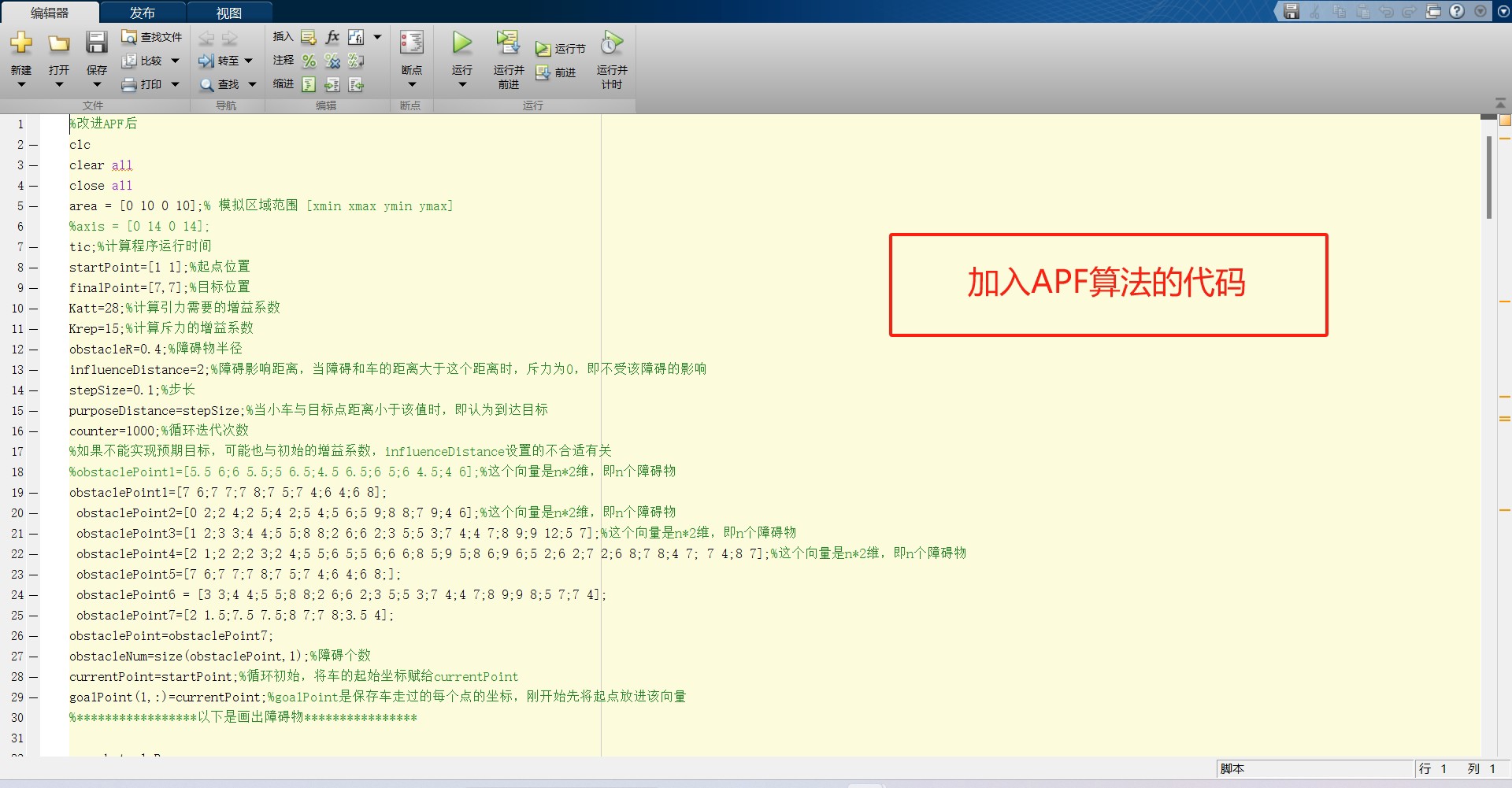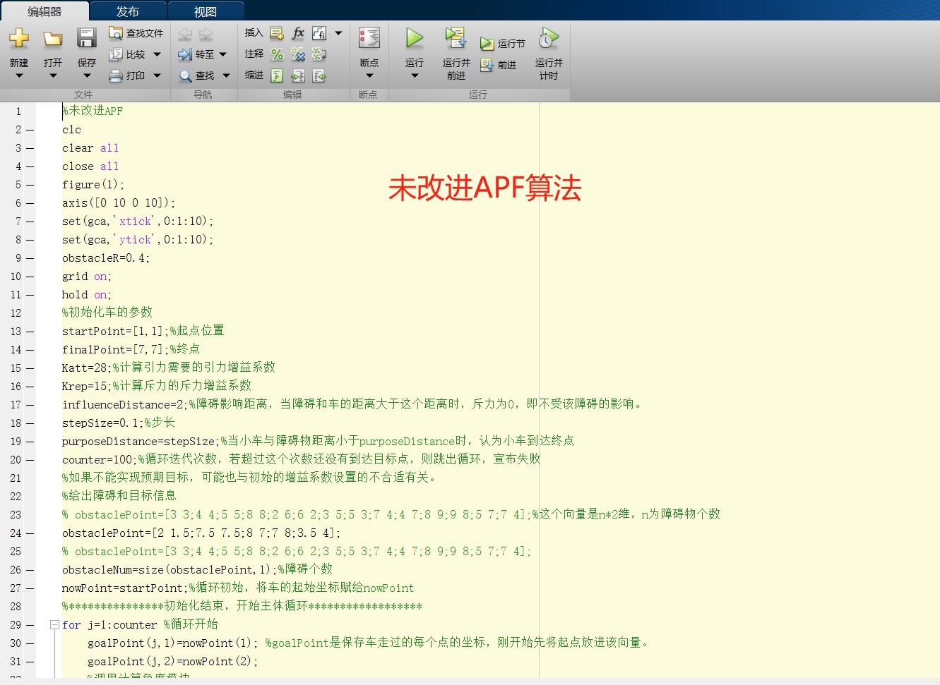 先来看未改进的APF算法实现。在Matlab里,我们首先要设定起始点、目标点还有障碍物的位置,这里咱们就根据需求随意设置一下。
