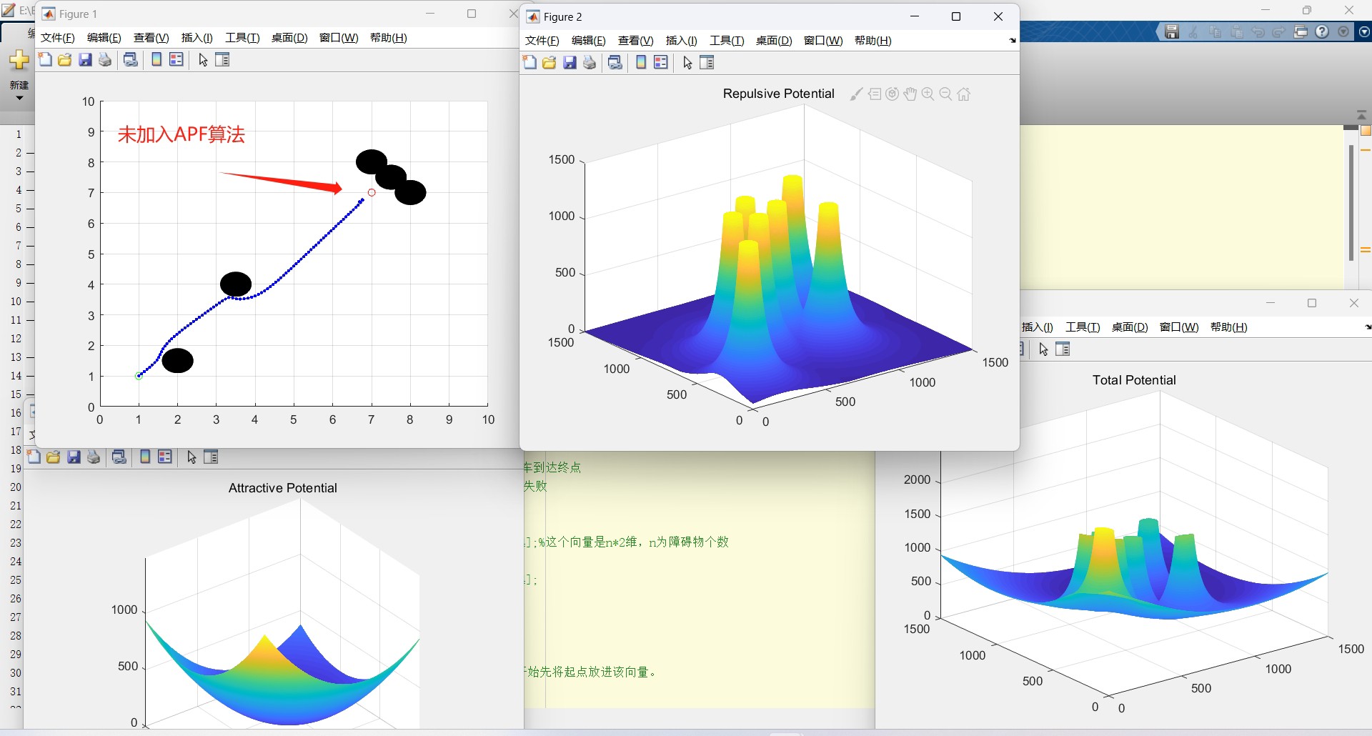 基于matlab实现改进的人工势场法,apf算法进行路径规划,通过改进斥力函数和引入模拟退火算法,克服局部极小值和目标不可达问题。 并附送未改进的apf算法,可做改进与未改进的效果比对使用,如图,未改进的算法会陷入局部极小值从而导致路径规划失败。 起始点位置,障碍物位置可以根据自己需求随便设置更改,自己设置地图进行路径规划,可自动生成斥力场,引力场,合力场。