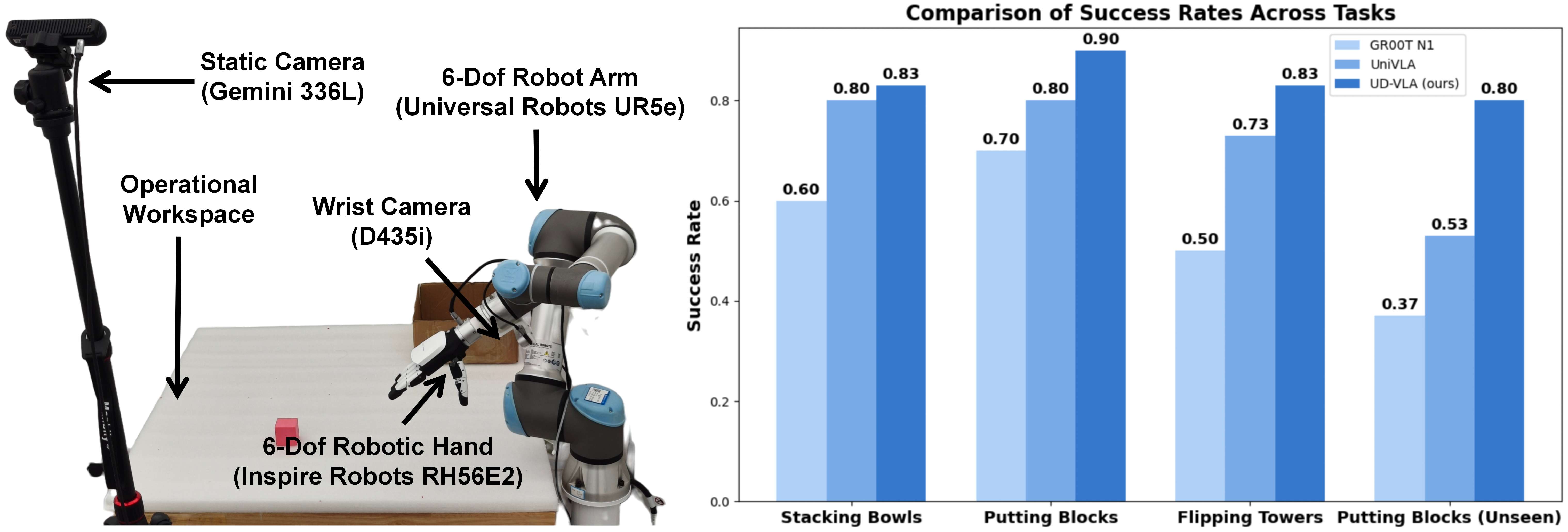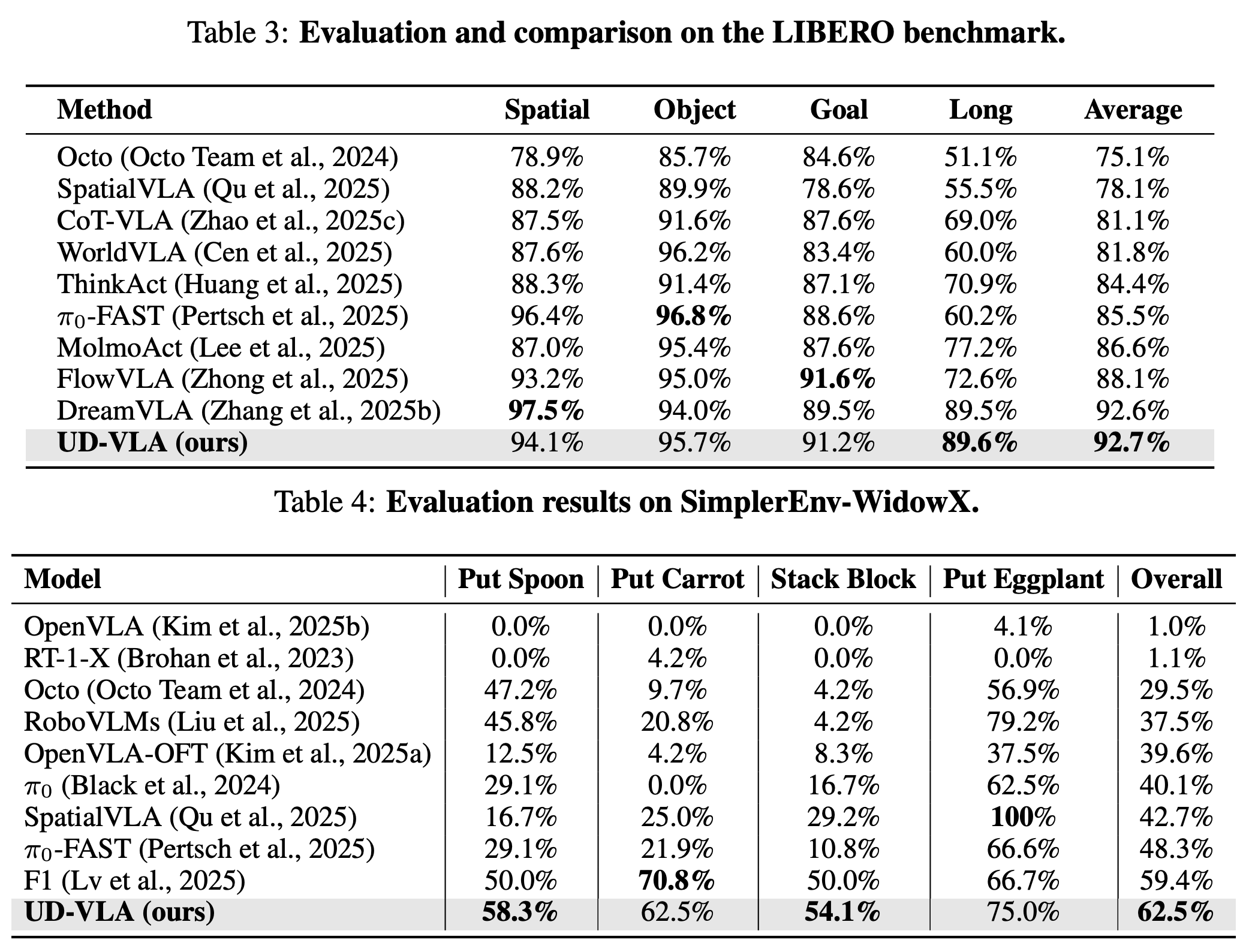 我们在Diffusion VLA方向上长期的尝试,在今年三月就探索了Parallel VLA的一种形式PD-VLA(uniform的迭代形式),它通过并行且多次迭代输出action,可以视作diffusion VLA的最早期探索,基于PD-VLA,我们进一步探索了Diffusion VLA的推理加速,通过一致性蒸馏的方式将基于OpenVLA的模型速度提升了四倍。得益于dllm的发展,Unified Diffusion VLA探索了多模态的生成理解统一的关键问题,我们希望他不仅可以作为好的开源VLA基座,也可以作为团队在diffusion VLA一系列研究上的最新结果提供给大家真正的insights。