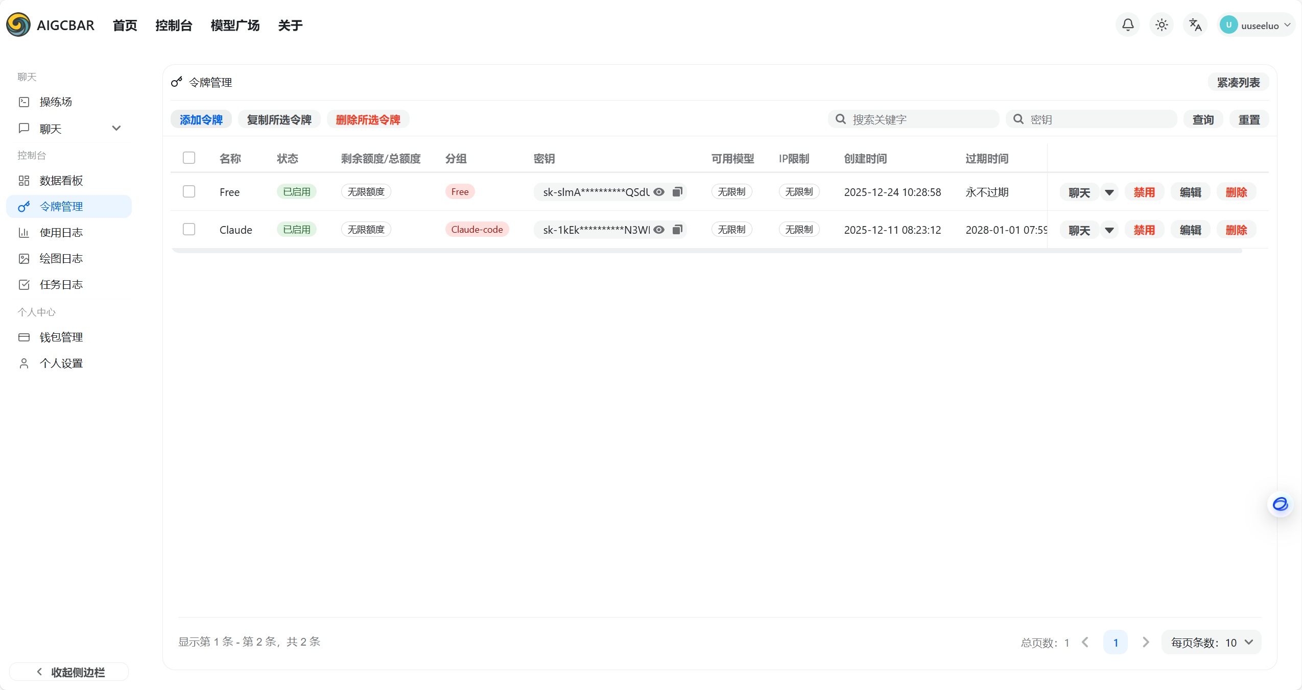 注册完成后,用户进入令牌管理页面,根据实际需求添加令牌,将看到自己生成的API密钥。这个密钥是访问所有AI模型的凭证,用户需要妥善保管并在应用启动时输入。为了安全起见,不建议在代码中硬编码API密钥,而应该通过环境变量或配置文件的方式存储。本应用设计了一个自动保存机制,用户首次输入API密钥后,点击"保存"按钮,系统会将密钥保存到本地文件中,下次启动应用时会自动加载,无需重复输入。