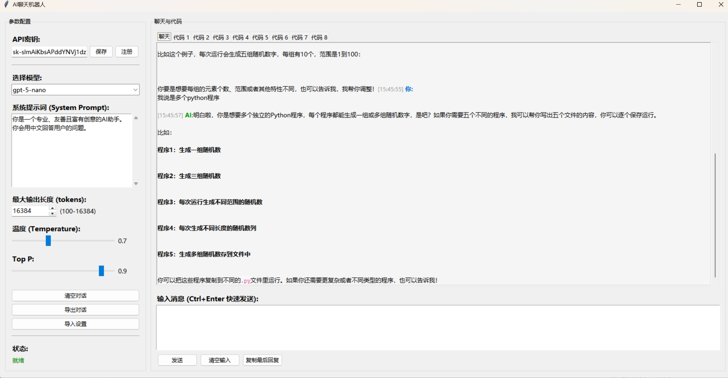 使用本应用的基础流程非常简洁。首先,用户启动应用后,在左侧参数面板的"API密钥"输入框中粘贴自己的API密钥,然后点击"保存"按钮,系统会将密钥保存到本地。其次,用户在"选择模型"下拉框中选择想要使用的模型,比如选择gpt-4.1-nano进行快速体验。如果需要自定义AI的行为风格,可以在"系统提示词"的大文本框中修改系统提示,比如可以将默认的中文助手改为特定行业的专家角色。然后用户在右侧的输入框中输入想要问的问题,点击"发送"按钮或按下Ctrl+Enter快捷键,应用就会向API发送请求。等待几秒钟后(具体时间取决于模型复杂度和网络延迟),AI的回答就会以流式的形式出现在上方的聊天展示区,用户可以实时看到回答的逐字生成过程。如果AI的回答中包含代码块,应用会自动创建新的代码选项卡,用户可以点击选项卡查看代码,右键选择"复制代码"将代码复制到剪贴板。
