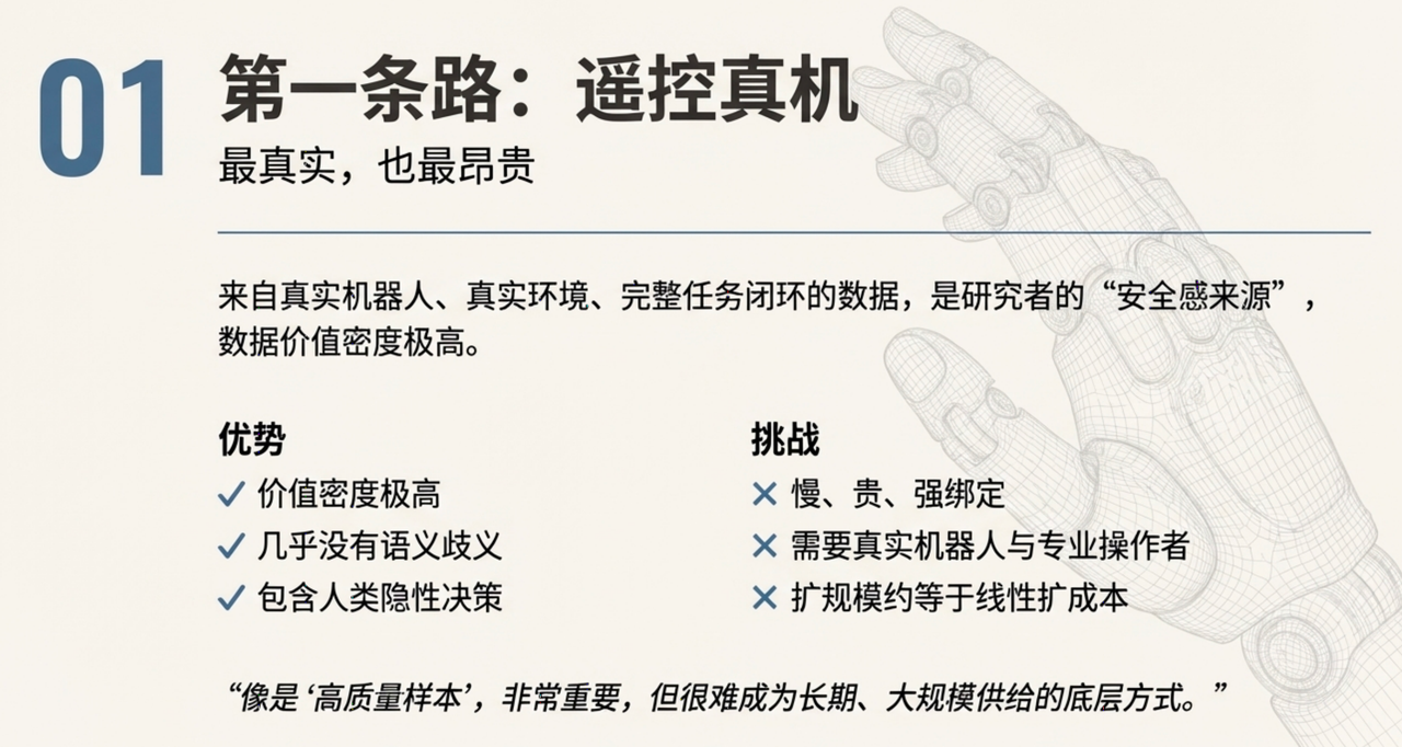 遥控真机像是“高质量样本”,非常重要,但很难成为长期、大规模供给的底层方式。