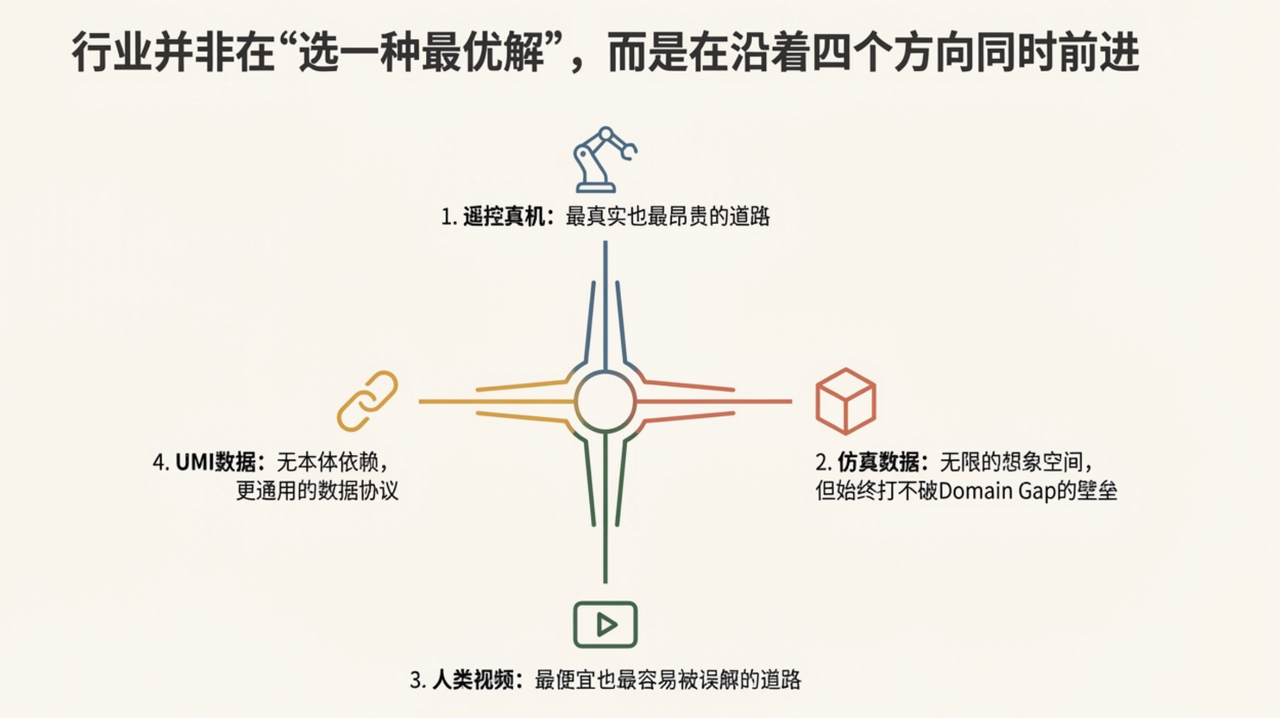 而我们把这四条数据路线并排来看,会发现它们已经不再是零散的方法选择,而是在实践中逐渐稳定为四种具身数据供给范式。