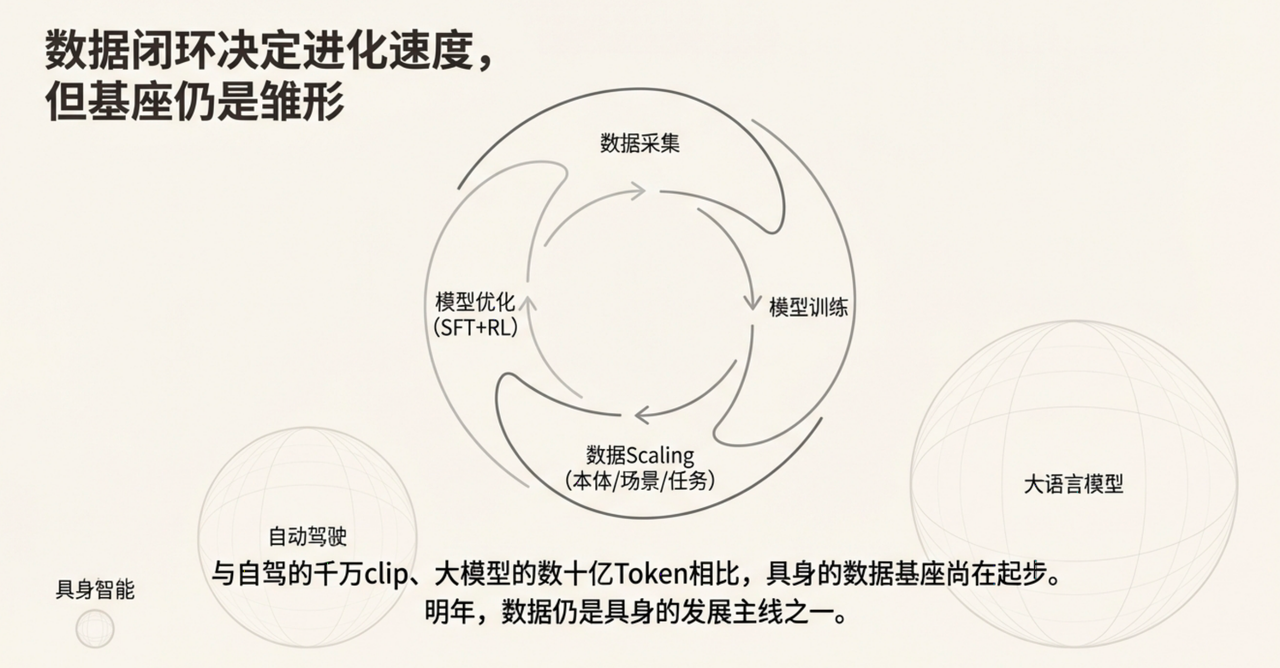 25年具身智能的发展,整体上围绕着 **数据采集 → 模型训练 → 数据scaling(本体/场景/任务) → 模型优化(SFT+RL)**的闭环链路不断提升大脑能力。