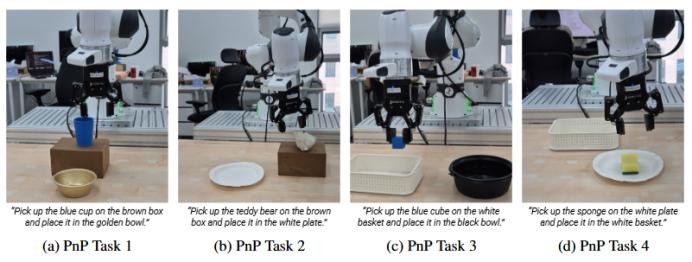 为了测试模型的泛化性,每种任务都跨越了人偶、杯子、立方体和海绵等多种物体类别,这些物体在几何形状、尺寸和物理特性上各不相同。