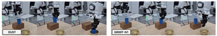 定性对比揭示了DUST成功的关键原因。以拾取蓝色杯子为例: