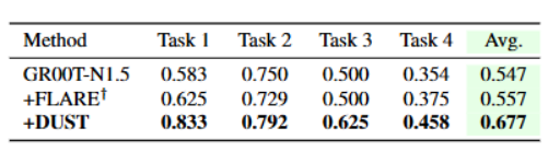 根据实验数据(见下表),在平均成功率方面,DUST达到了67.7%,显著超过了强大的基准模型GR00T-N1.5(54.7%)和 FLARE 改进型(55.7%) 。这意味着DUST相比标准VLA模型在真实世界中实现了约 13% 的性能提升 。
