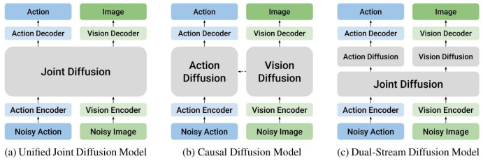 VLA 模型往往直接从视觉特征映射到动作序列,忽略了动作与环境变化之间的内在动力学。虽然部分研究尝试通过“世界模型”来预测未来状态,但由于动作(低维、时间平滑)与视觉观测(高维、空间结构化)这两种模态在统计属性上存在巨大差异,强行将其融合在统一的潜空间中往往会导致“模态冲突”,影响模型精度。