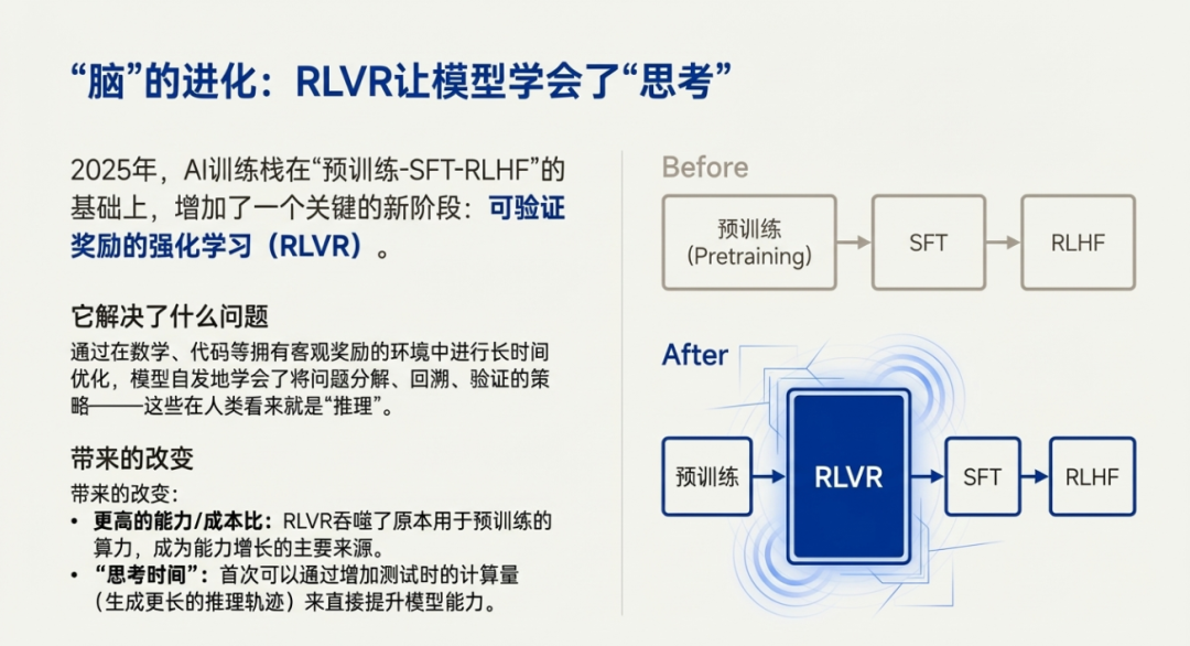 卡帕西提出一个重要技术方向:RLVR(Reinforcement Learning with Verifiable Rewards)。