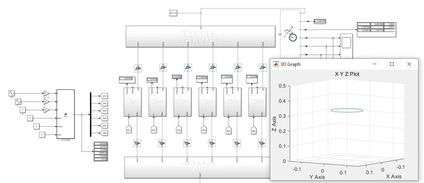 MATLAB并联机器人Stewart并联平台仿真s运动学逆解并联机器人运动学、动力学、算法、三维仿真Matlab Simulink simscape仿真自建仿真在机器人领域,并联机器人以其独特的结构和性能优势,吸引着众多研究者的目光。Stewart并联平台作为一种典型的并联机器人,在运动控制、精密定位等方面有着广泛应用。今天,咱就来唠唠如何在MATLAB环境下对Stewart并联平台进行全方位的仿