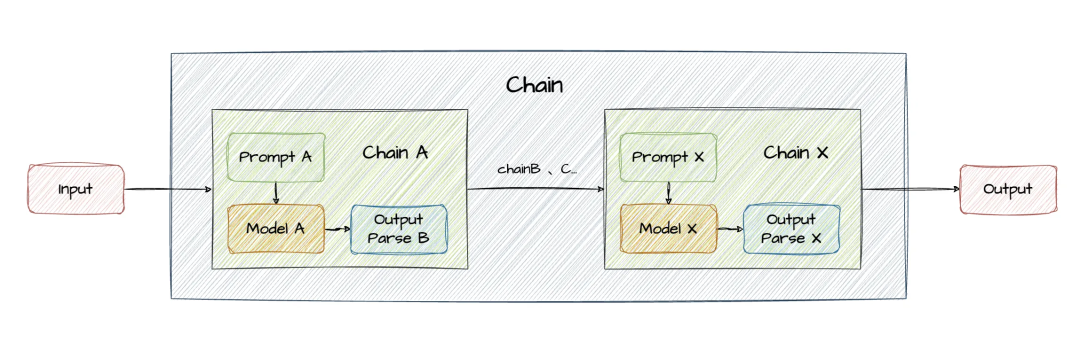 - Chains(链):用于链式工作流编排,将多个模块串联起来组成一个完整的流程,例如,一个 Chain 可能包括一个 Prompt 模板、一个大模型和一个输出解析器,它们协同工作,处理用户输入并返回结果。