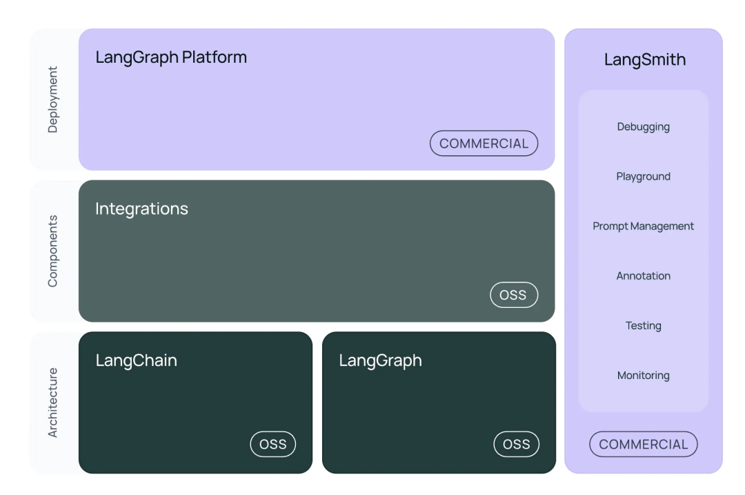 | 生产部署与调试 | 缺乏标准化工具,监控和调试较困难 | 提供LangSmith等平台,用于监控、追踪和调试应用性能 |