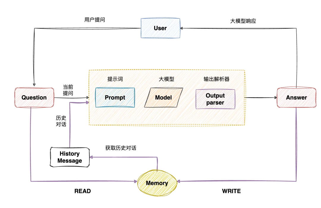 - Memory(记忆):用于保存历史对话和上下文信息,以便在后续对话中使用,从而实现有状态的对话。