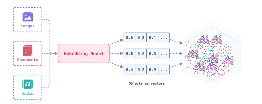 它的核心任务是将文字、图片等非结构化数据,转换成高维空间中的数值向量。并且能够将语义相近的内容在向量空间中的位置也映射得更近。