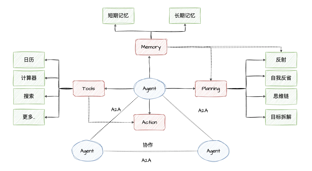 通过这个比喻,我们可以清晰地看到:LLM是智能的核心(脑)、RAG是知识储备(图书馆)、Agents是协调指挥官(神经系统)、Tools是执行手段(手脚)、Chains是自动化技能(肌肉记忆)、Memory是上下文感知(短期记忆),它们各司其职,紧密协作,共同构成了一个能够理解、推理并作用于外部世界的智能体。