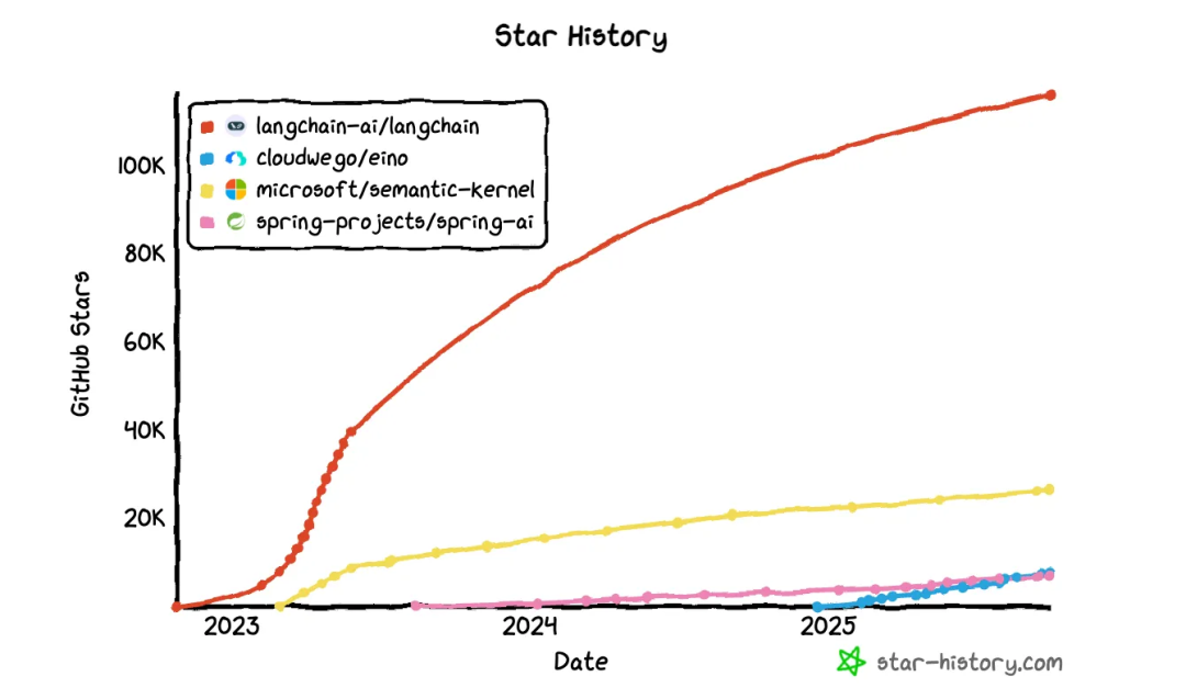 随着ChatGPT、DeepSeek等大模型(LLM)的崛起,开发者已不满足于简单的对话框交互,而是迫切希望将其深度集成到自己应用中,以构建更强大的智能应用。因此,市场上涌现出诸多大模型集成框架,如LangChain(LangChain4j、LangChainJS)、LlamaIndex、Spring AI、Semantic Kernel、Eino等。其中,其中LangChain是这些框架中出现最早,且最成熟的框架,已成为LLM开发中最受欢迎的框架之一。
