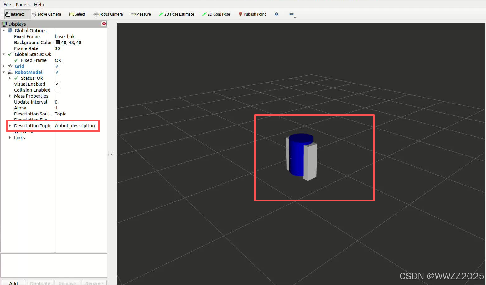 (3)选择robot_description加载模型,输入后点击空白处模型即可加载出来
