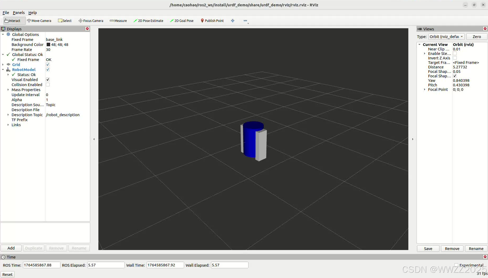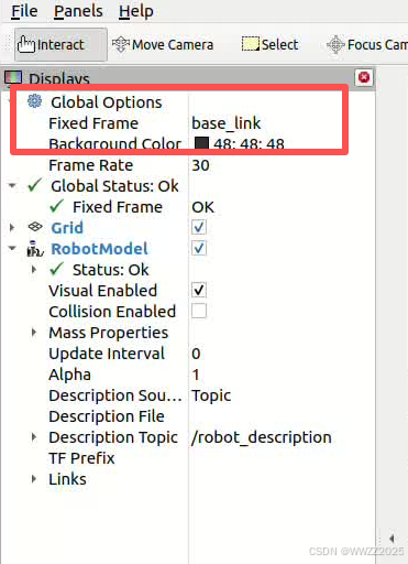 cd ~/ros2_ws colcon build source ./install/setup.bash ros2 launch urdf_demo rviz_view.launch.py(1)Rivz中设置base_link