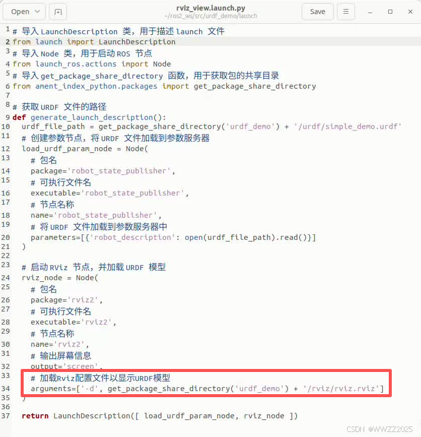 cd ~/ros2_ws/src/urdf_demo/launch gedit rviz_view.launch.py
