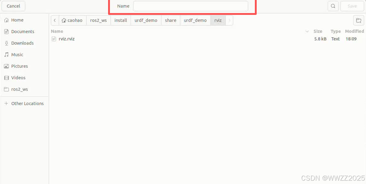 左上角File-Save Config As,设置工程名“rviz.rviz”-Save