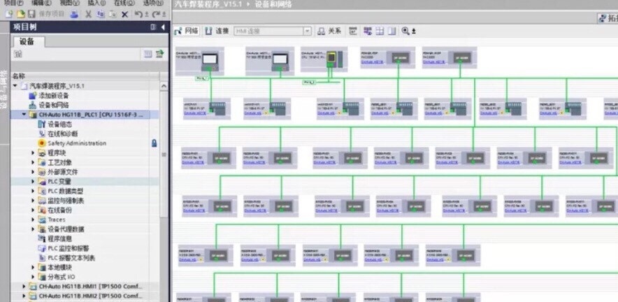 这个项目可不是小打小闹,它包含了1台西门子1500PLC程序,同时搭配2台触摸屏TP1500程序来实现人机交互。从网络连接上看,有9个智能远程终端ET200SP通过Profinet连接,15个Festo智能模块、10台Fanuc发那科机器人、3台G120变频器也都通过Profinet进行通讯。另外,还有2台智能电能管理仪表PAC3200。不仅如此,项目里还有4个GRAPH顺控程序,以及涉及图尔克RFID总线模组通讯,并且要和MES系统通讯,甚至还用到了西门子安全模块。值得一提的是,项目内含GSD文件,方便应用到其他项目。