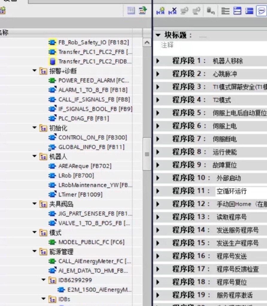 西门子PLC1500大型程序fanuc机器人焊装 包括1台 西门子1500PLC程序,2台触摸屏TP1500程序 9个智能远程终端ET200SP Profinet连接 15个Festo智能模块Profinet通讯 10台Fanuc发那科机器人Profinet通讯 3台G120变频器Profinet通讯 2台智能电能管理仪表PAC3200 4个GRAPH顺控程序 图尔克RFID总线模组通讯 和MES系统通讯,西门子安全模块 内含GSD文件,可供其他项目使用 程序经典,结构清晰,SCL算法,堆栈,梯形图,结构化编程,想学习项目累计经验时间可以借鉴思路 15.1版本以上可以打开