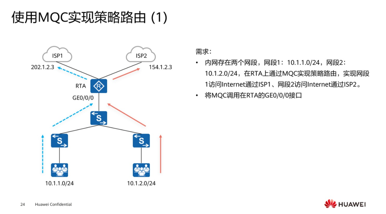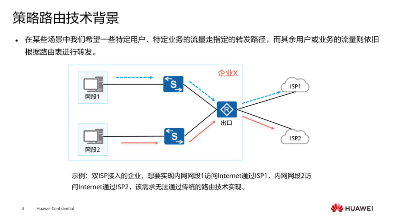 希望网段1,或者说是某一个部门,它能够去访问ISP1,另外一个网段2或者另一个部门,它能够去访问ISP2,也就是说不同的网段或者不同的部门之间,它们通过不同的运营商去访问外部网络,而这样的一个需求,传统的路由技术是无法去实现的。如果是传统的路由,会形成一个怎样的后果,在路由选择方面,出口连接两个不同的运营商,它要想去访问外部网络,要么通过第一种情况实现流量的负载分担,但是无法把控不同的网段通过不同的运营商进行访问外网。