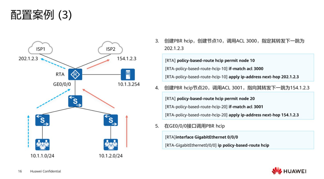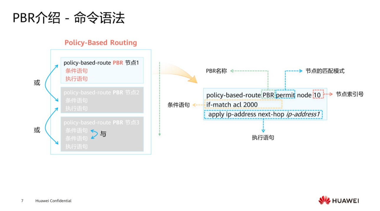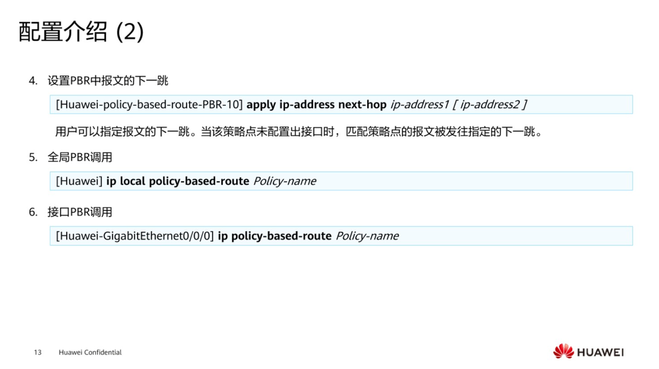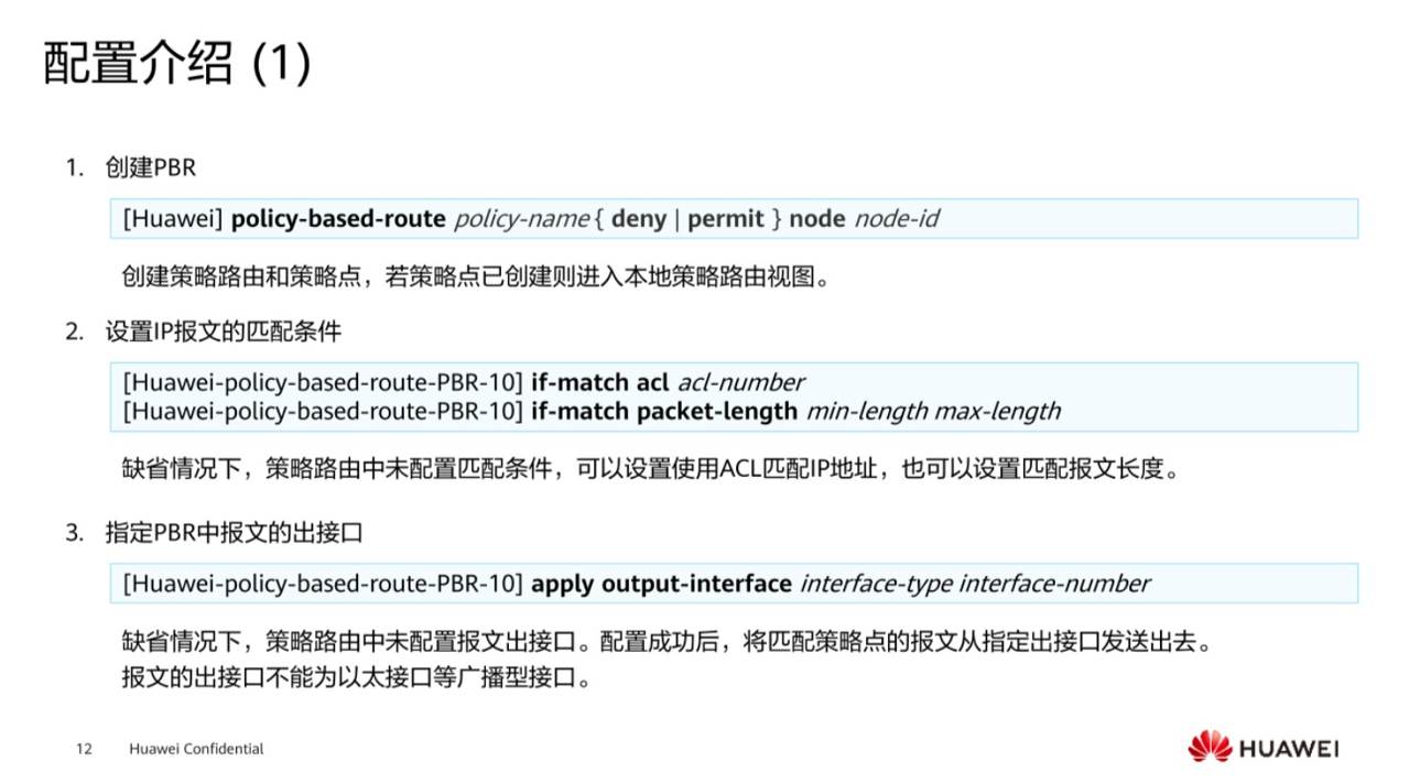 首先去创建一个PBR,名称就叫做PBR,然后该节点的匹配模式是permit或者是deny,后面再跟上该节点的索引号,然后在该节点下面去写相应的条件语句,if-match 可以跟上ACL,IP前缀列表,目的IP地址等等,最后去执行相应的操作,去修改它的下一跳或者出接口,这里可以类似参考Route-Policy。