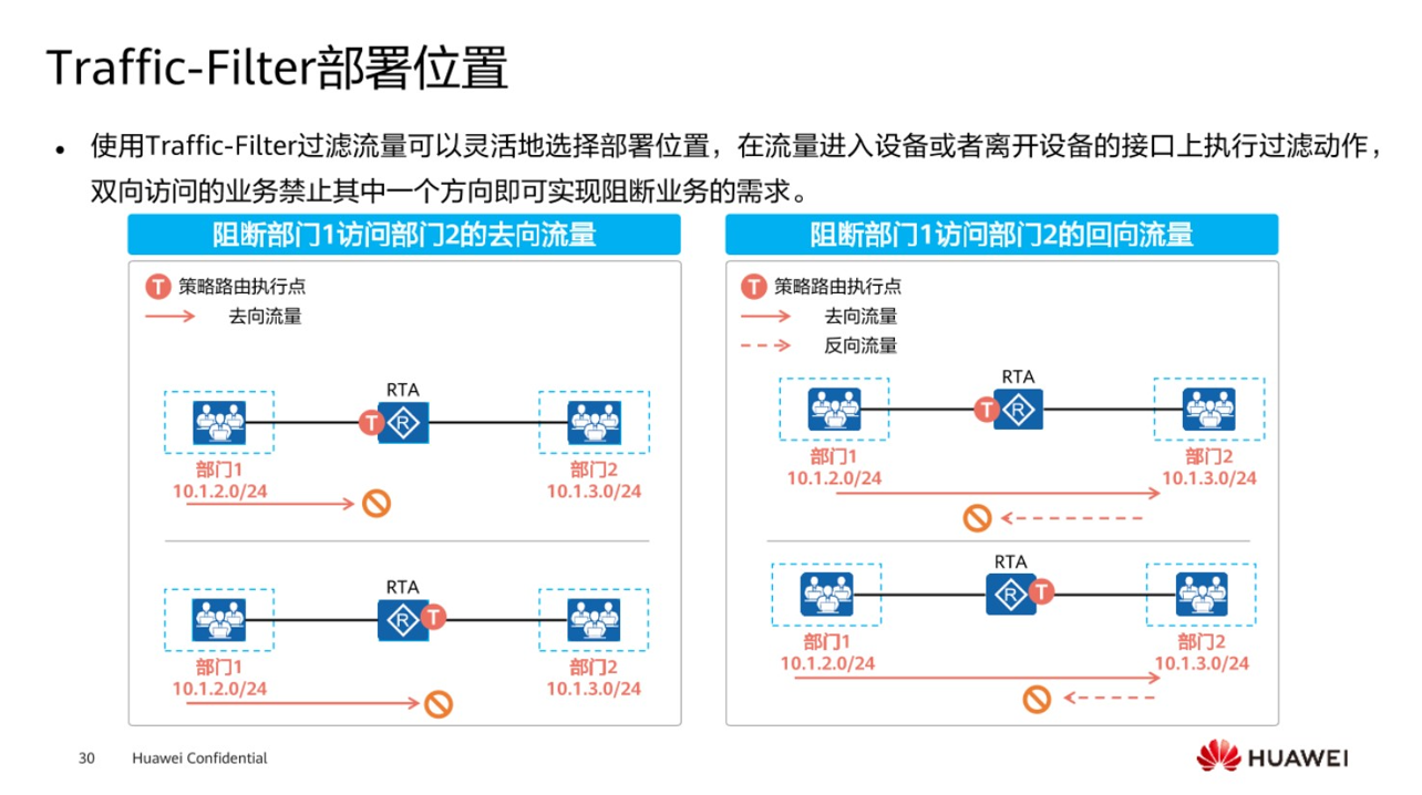 比如税部门1和部门2之间去访问,先从部门1去访问部门2这样去流量上面,去实现一些Traffic-Filter的部署,可以在RTA的入方向,或者说RTA的出方向上面去部署相关的Traffic-Filter,来实现部门1无法访问部门2。同时也可以换一个方向,正常部门1发数据包给部门2,部门2接收了,还要回数据流量,因此可以针对反向流量来做一些过滤,反向流量方向,也可以在RTA相关出方向上面或者入方向去部署。也就是说Traffic-Filter的实际部署是根据流量的方向以及流量方向所对应的入接口和出接口上面进行一个选择,从而实现一个部署的正确性。