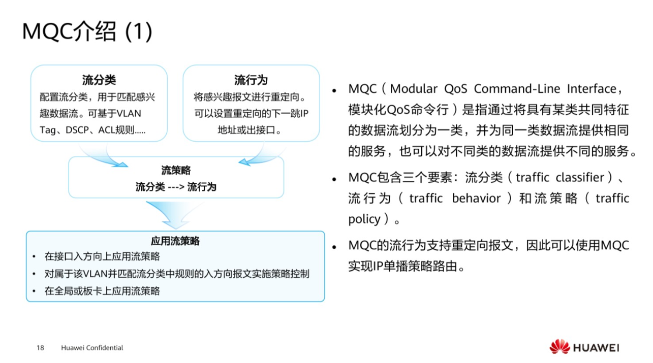 MQC是指模块化QoS命令行,它是指将具有某类特征的数据流分为一类,它一共有三大模块组成,流分类,流行为,流策略。