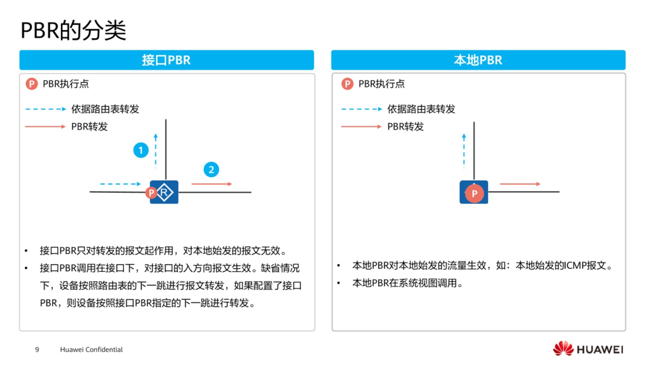 一种是关于接口的PBR ,一种是关于本地的PBR,接口的PBR需要注意一下,只针对转发的报文起作用,如果是本地始发的报文,基于接口的PBR是不生效的。 而本地的PBR是只针对本地始发的流量生效,对转发的流量是没有任何变化的,它们两个刚好是反过来的,一个是在系统视图下去调用本地的PBR,接口PBR是在接口下面去使用的。