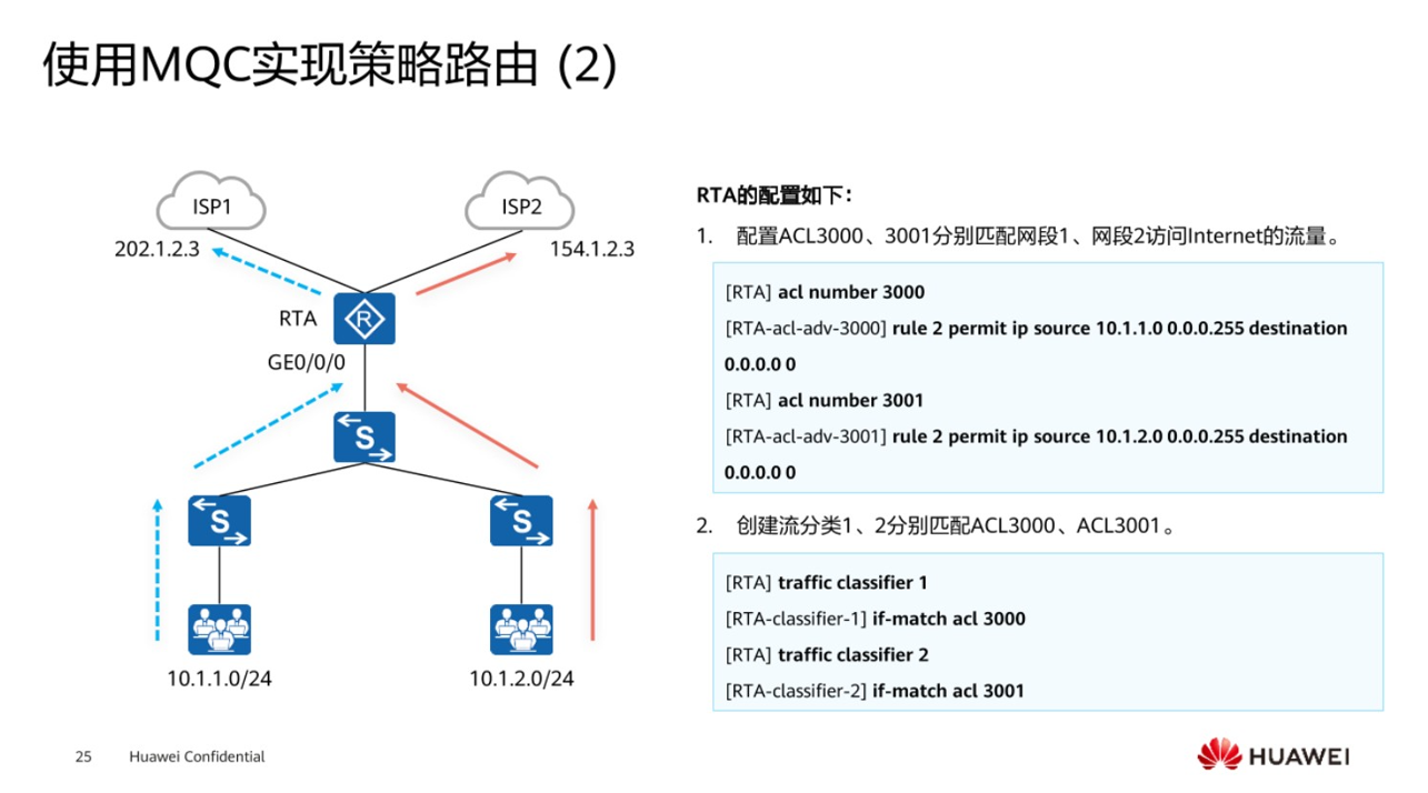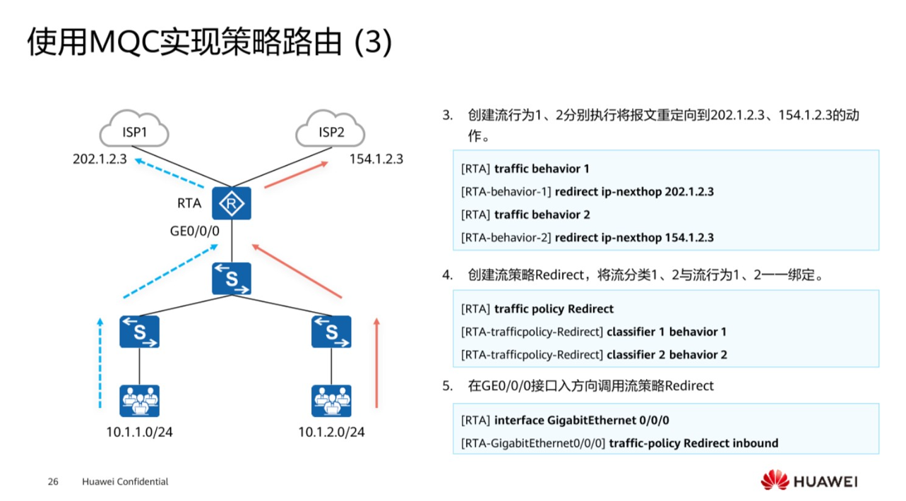 流行为,包括报文过滤,重标记优选级,重定向,以及流量统计等等,PBR只能应用在三层设备上,而MQC,不仅可以用在三层设备上,也可以用在二层交换机上,也就是说关于MQC,它的应用范围实际上比PBR更加宽广一点。