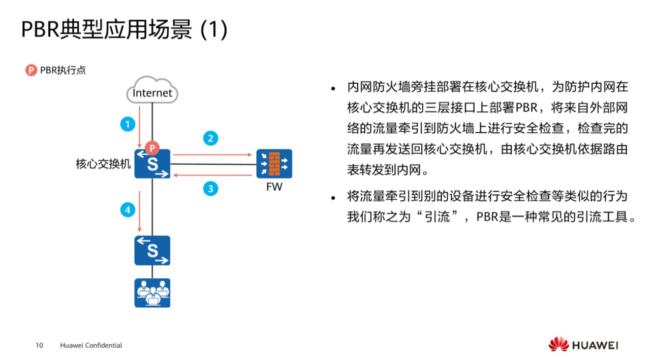 它有一个非常典型的应用场景,在正常的情况下,在一个网络组成的成分中,不可能仅仅只有路由交换,同时还会涉及到其它的一些策略,比如说要对数据流量进行一个安全扫描,保证一个数据交互过程中没有任何病毒,这个时候内网可以通过旁挂部署方式,将防火墙挂在核心交换机旁边,这个时候会有一个什么问题,如果基于正常的路由表转发数据,从外面进来的流量交给核心交换机之后,会直接提交给用户终端,但是从外网回过来的数据包,一般需要进行病毒扫描,防止里面包含一些木马或者蠕虫病毒,这个时候可能使内网造成一些安全威胁,因此现在从核心交换机收到数据流量之后,因为通过旁挂式部署了防火墙,这个时候将流量牵引到防火墙上,使防火墙对于流量进行一体化扫描,当确保该流量安全,没有任何威胁的时候,再将流量迁回到核心交换机,然后核心交换机再层层递交给终端用户,这个时候就需要对流量做一个牵引的这样的一操作。常见的情况下在核心交换机的入口部分,做一个类似于接口的PBR,将流量重定向到防火墙上,对安全进行一个检查。