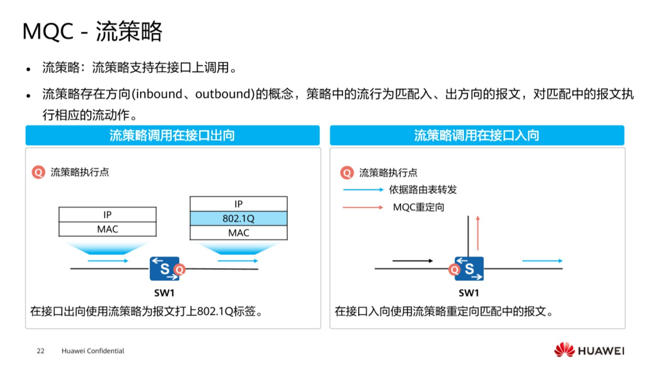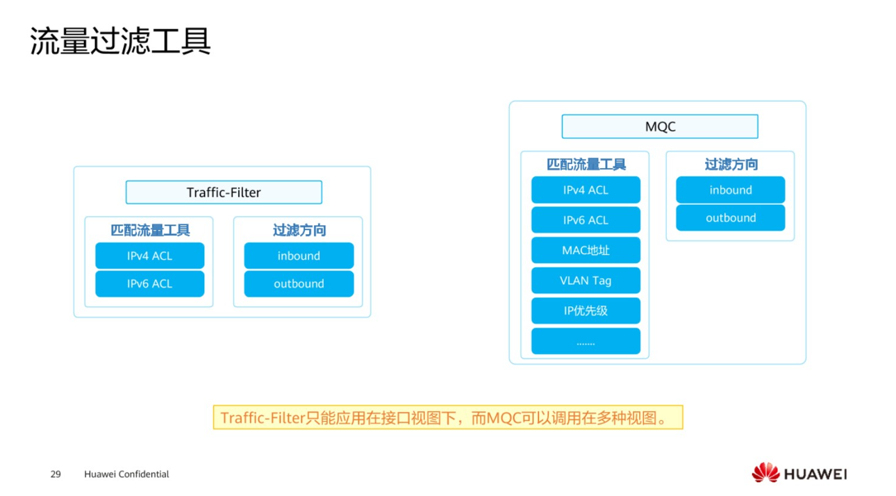 可以使用Traffic-Fillter,也可以使用MQC技术,不同之处在于Traffic-Filter它匹配的一个工具比较少,基本上是根据ACL,方向是Inbound和Outbound,同时只能在接口视图下去调用。而MQC它所匹配流量的工具就非常多了,不仅有ACL,还包括其它的IP优选级,VLAN标签等等。同时MQC可以在多种视图下去调用它,也就是说应用起来更加广泛。