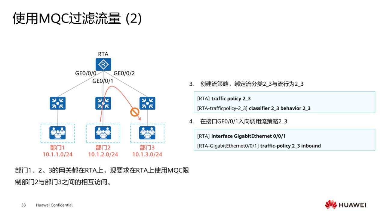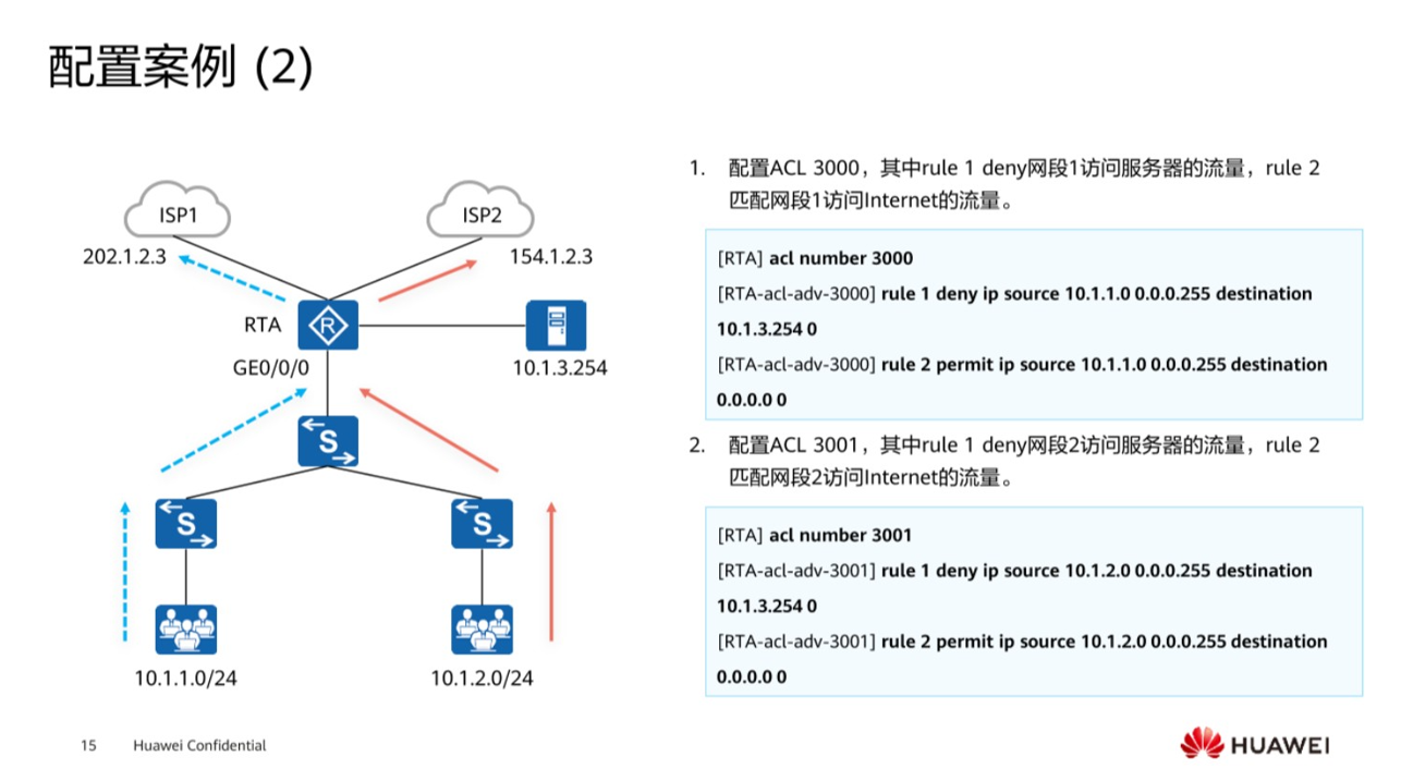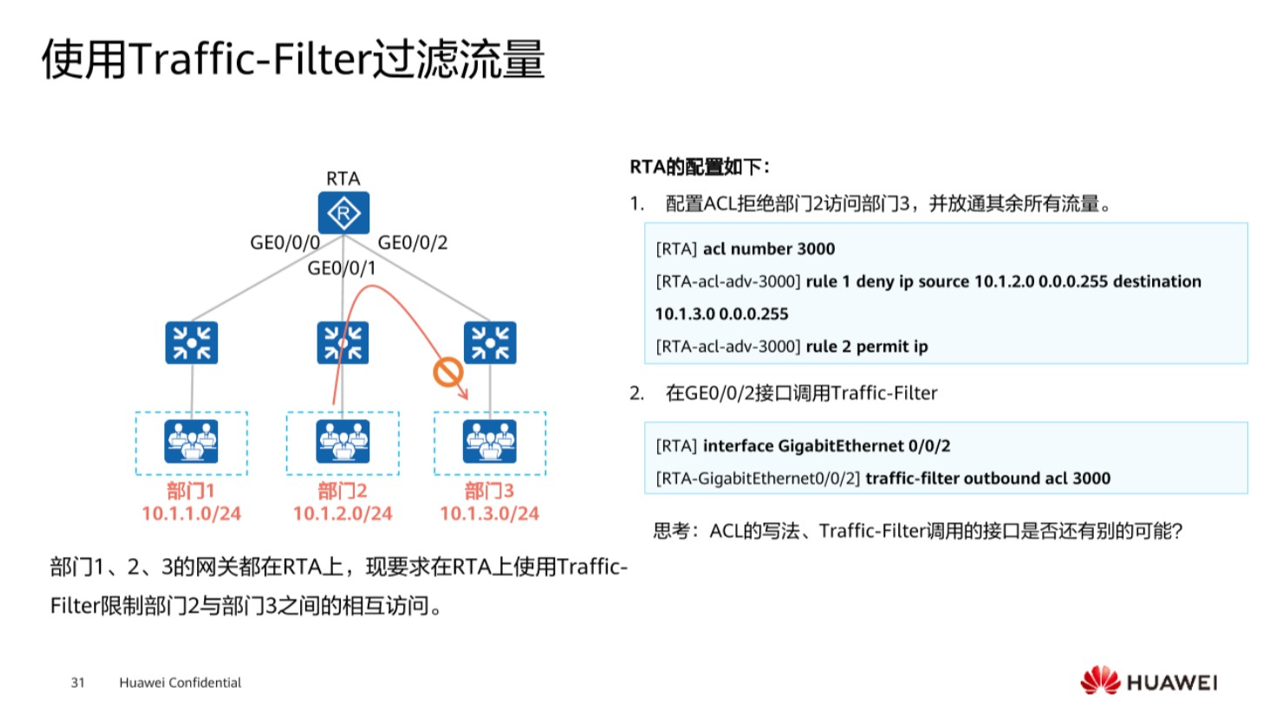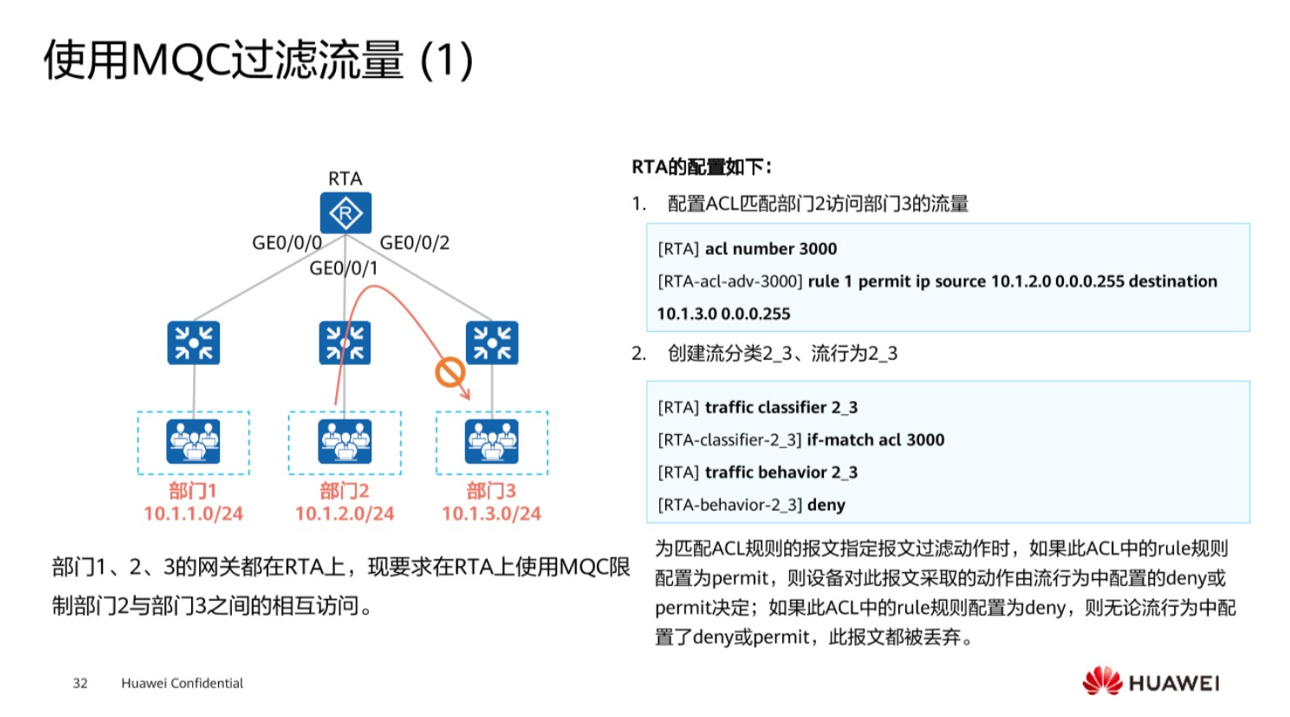首先在RTA上创建了一条ACL,ACL匹配的流量是来自于10.1.2.0/24这个网段,部门2的网段,目的网段是10.1.3.0/24,部门3的网段,执行的动作是deny。其它流量正常放行,然后在G0/0/2的接口上面去调用,调用的方向是outbound,然后去调用ACL 3000。