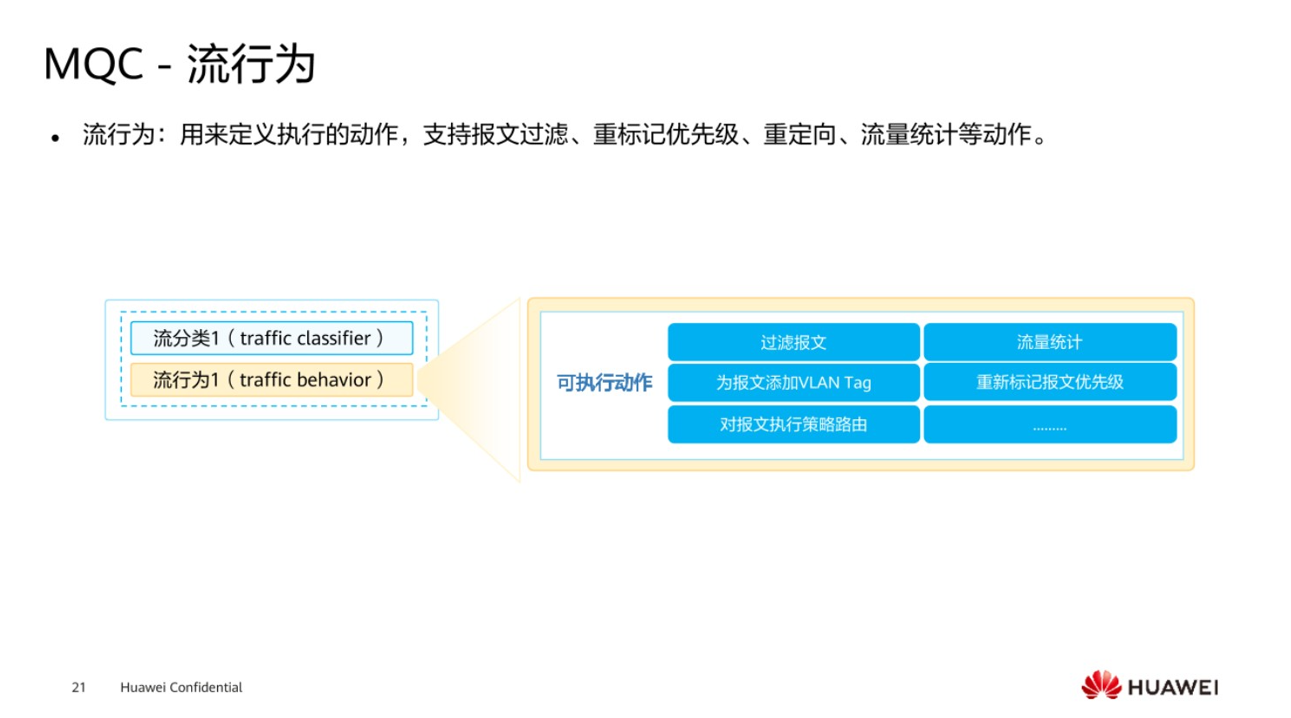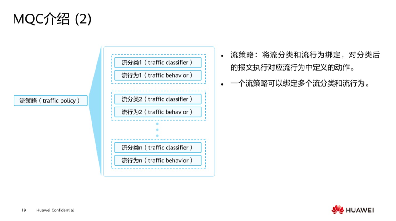 最后将流分类和流行为绑定在一起,就成为了这样的一个流策略。在现网中MQC一般会和QoS结合 在一起去使用,