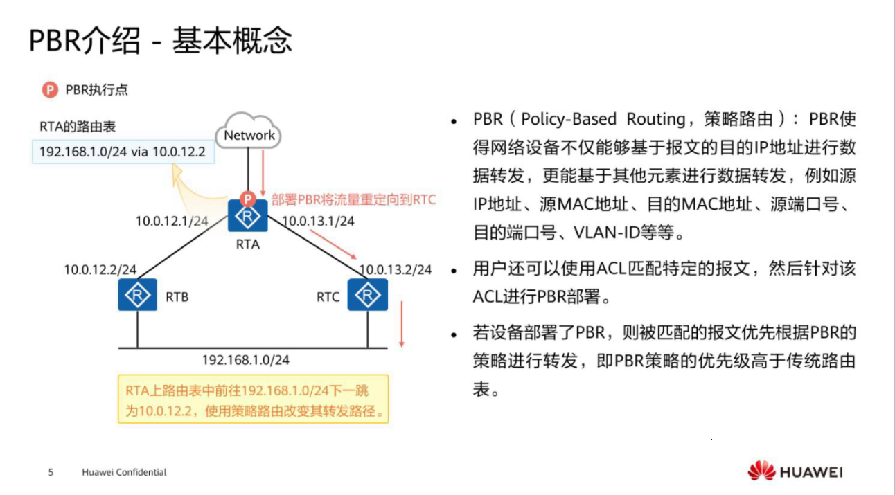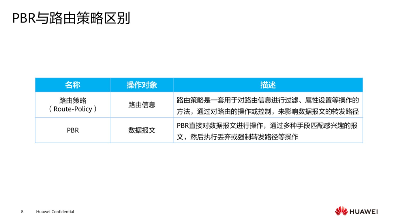 在策略路由里面所使用的一个工具叫Policy-Based Routing,也就是PBR,它能够根据到达报文的目的IP地址,进行一个数据包的匹配,然后再定义相关的动作,更改下一跳或者出接口。当然它匹配的条件有很多,不仅能够根据目的IP地址进行数据包的这样的一个匹配,同时也能够根据其它元素进行匹配,比如说源目MAC,VLAN号,源目端口号等等。也可以和ACL这样的一个匹配工具来进行一个联合使用。