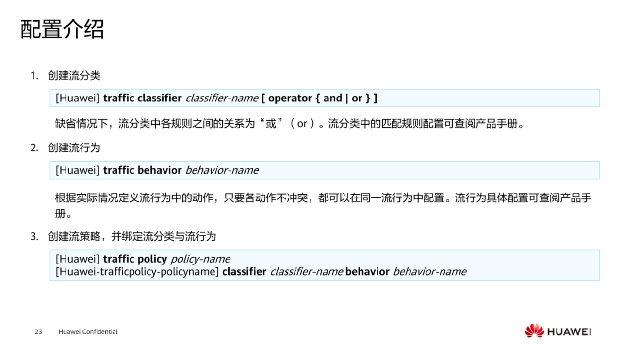 流策略是指将流分类和流行为绑定在一起,然后执行相应的动作。一条流策略,可以包含多个流分类和流行为,在同一个策略里面,它们的关系是"或"的关系。