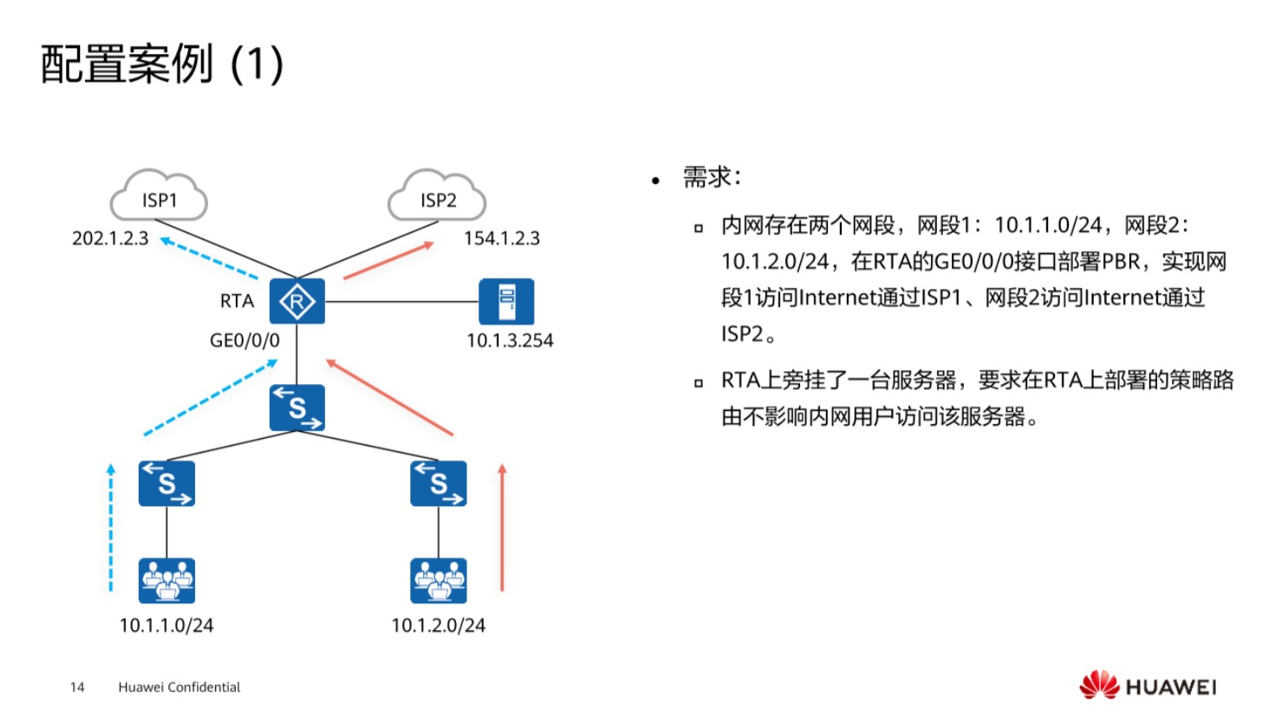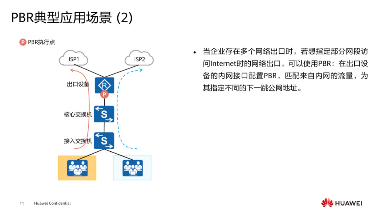 比如说企业出口连接了多个不同的运营商,现在要保证不同部门之间访问用户流量完全隔离开,比如说希望研发部通过左边的网络访问外部,可能左边的通信质量好一点,研发部又是一个比较重要的部门,希望右边平台工作人员通过右边访问外部,可能针对生产网络而言,生活这样的一个网络,没有必要要求链路质量那么高的要求,这样的时候可以在出口的路由器上面基于接口云调用PBR,抓取不同部门的这样的一个流量,然后执行不同的下一跳,业将它们的流量完全分开。保证生产和生活网络的流量进行分区。